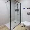 Baño elegante con ducha espaciosa y toallas suaves