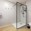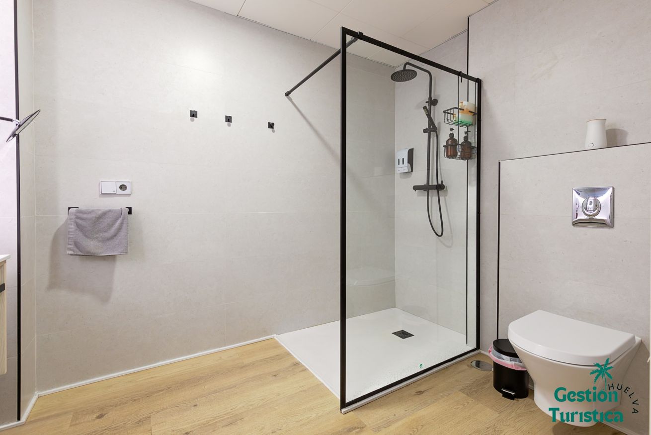 Baño elegante con ducha espaciosa y toallas suaves