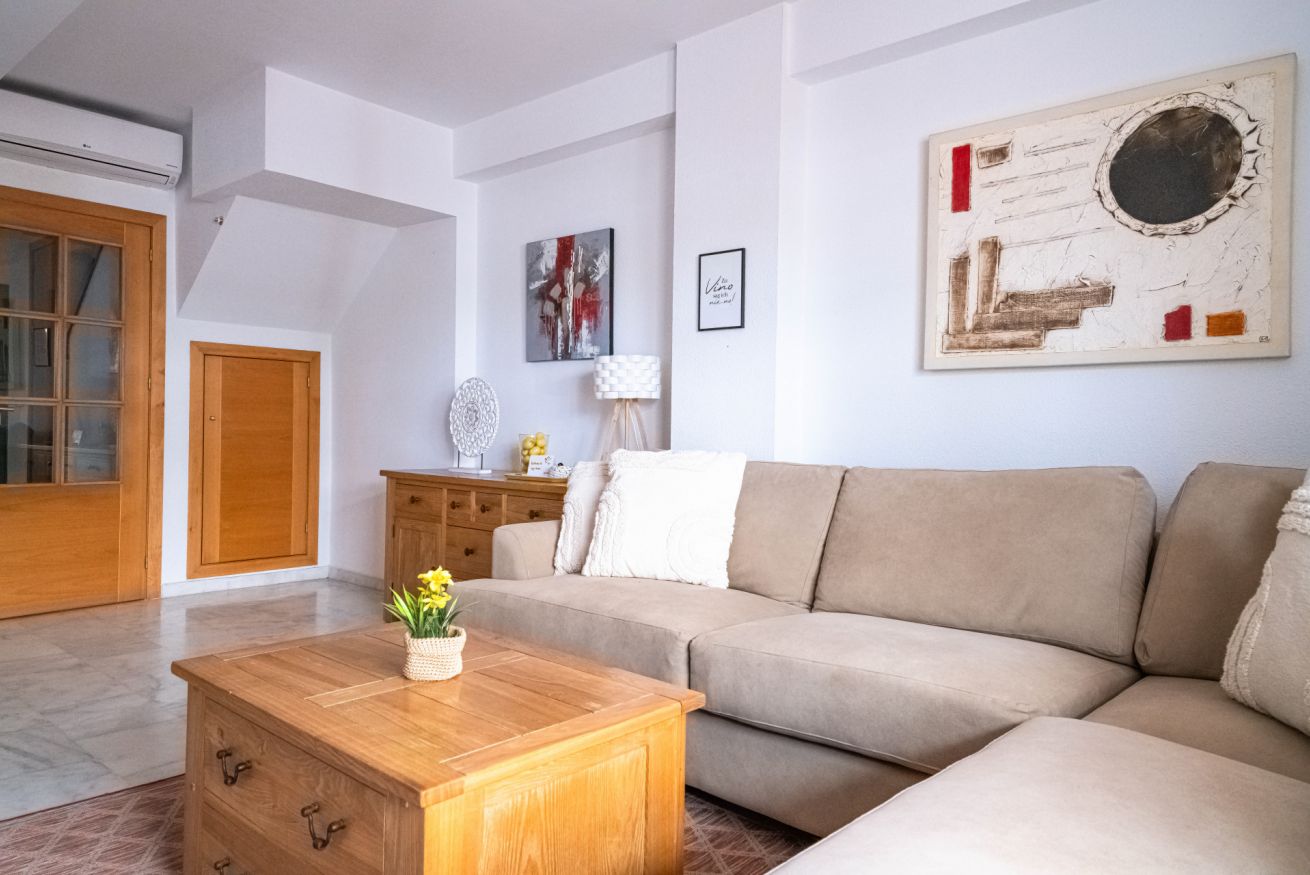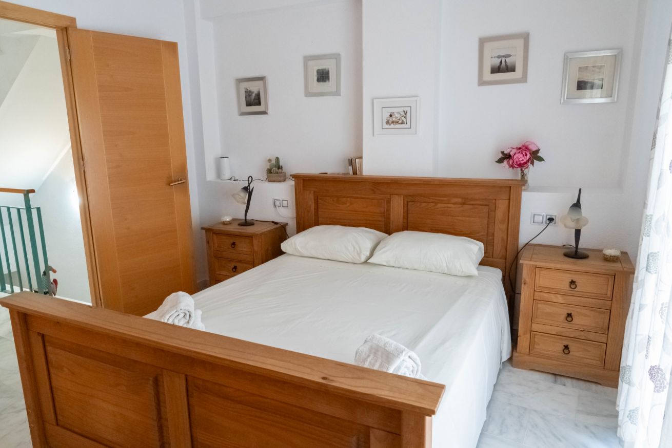 En la planta primera se encuentra el dormitorio principal tipo suite, con 1 cama de matrimonio y un gran armario empotrado. El dormitorio cuenta con su propio cuarto de baño completo. También dispone de una terraza con mobiliario. En esta misma planta hay otro dormitorio con 2 camas individuales y un gran armario empotrado. También hay otro cuarto de baño completo con ducha.